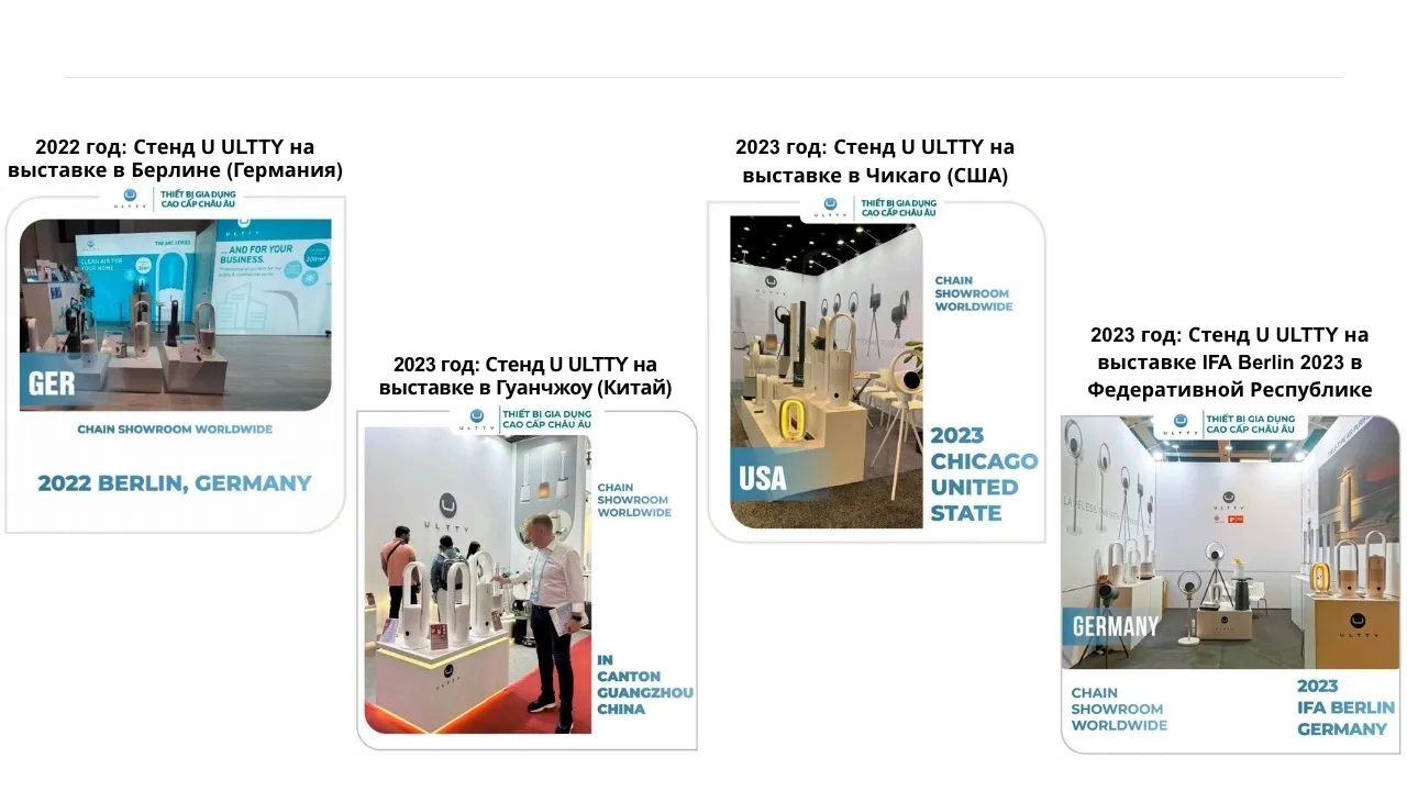 ULTTY регулярно участвует и демонстрирует продукцию на ведущих мировых технологических выставках, таких как IFA (Берлин, Германия) и CES (Чикаго, США), подтверждая своё лидерство в отрасли бытовой техники