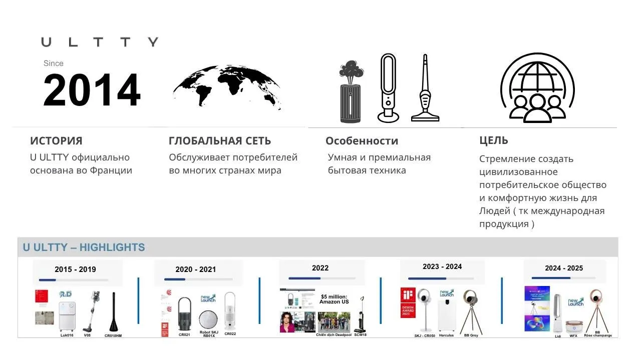 ULTTY — это бренд премиальной бытовой техники с 12-летним опытом, вдохновлённый французским дизайном и технологиями. Мы с гордостью подтверждаем наш международный статус через сильное юридическое присутствие: бренд ULTTY зарегистрирован и защищён в 27 странах, включая Европейский Союз, Китай, Вьетнам, Таиланд и, особенно, в РОССИЙСКОЙ ФЕДЕРАЦИИ.