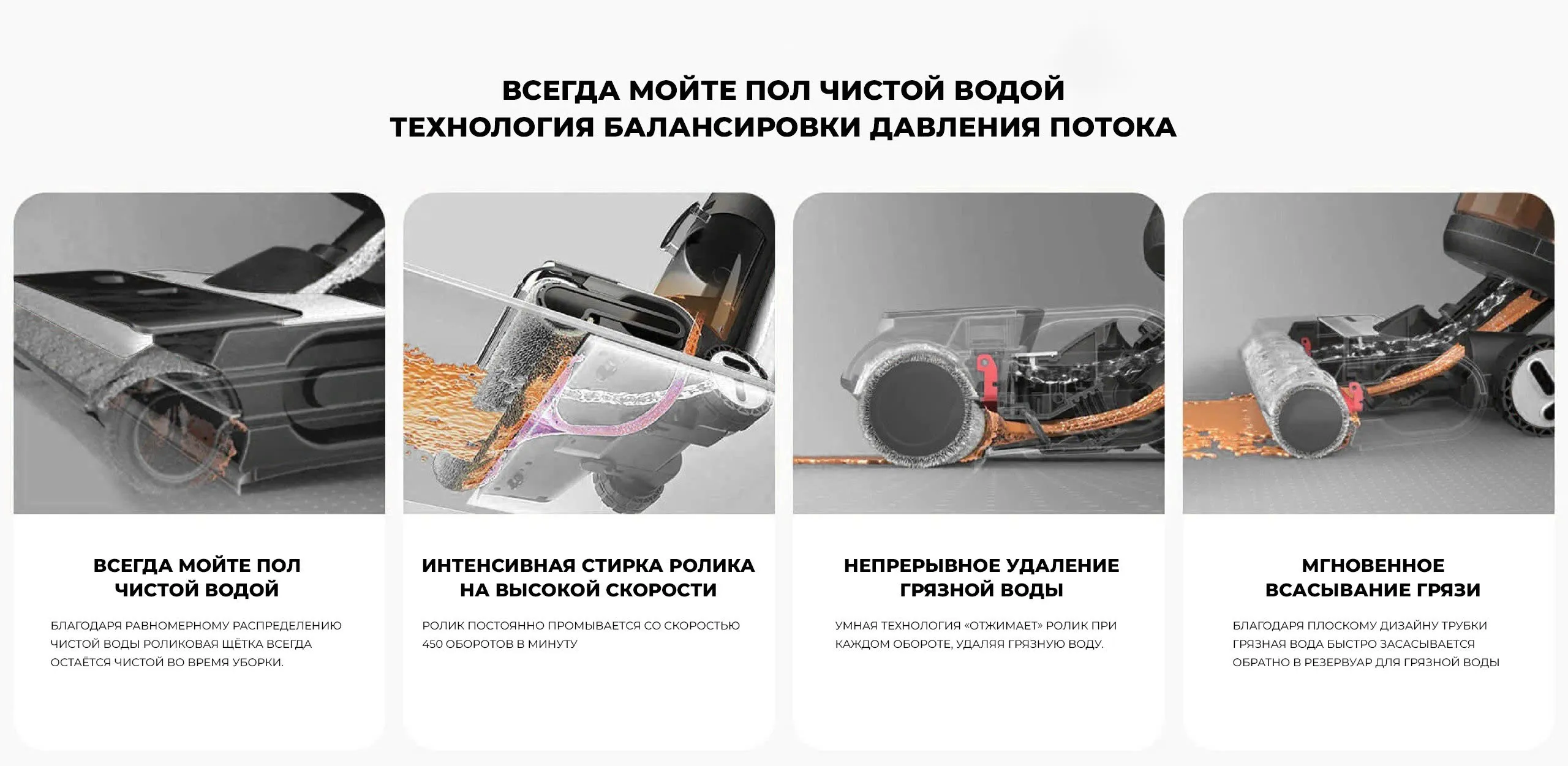 Обеспечивает чистоту ролика и блеск пола с помощью 4 шагов: равномерное смывание чистой водой, стирка на высокой скорости вращения, непрерывное отжимание грязной воды и немедленное всасывание грязи.