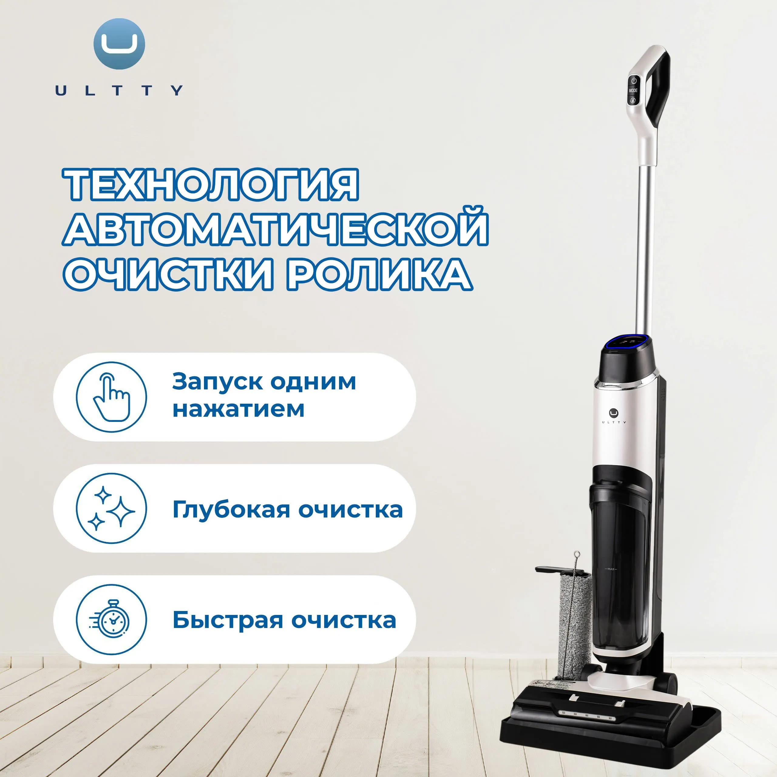 моющий пылесос ULTTY SCW18 оснащён системой автоматической стирки тряпки, которая поддерживает её чистоту и обеспечивает уборку после каждого использования без лишних усилий.