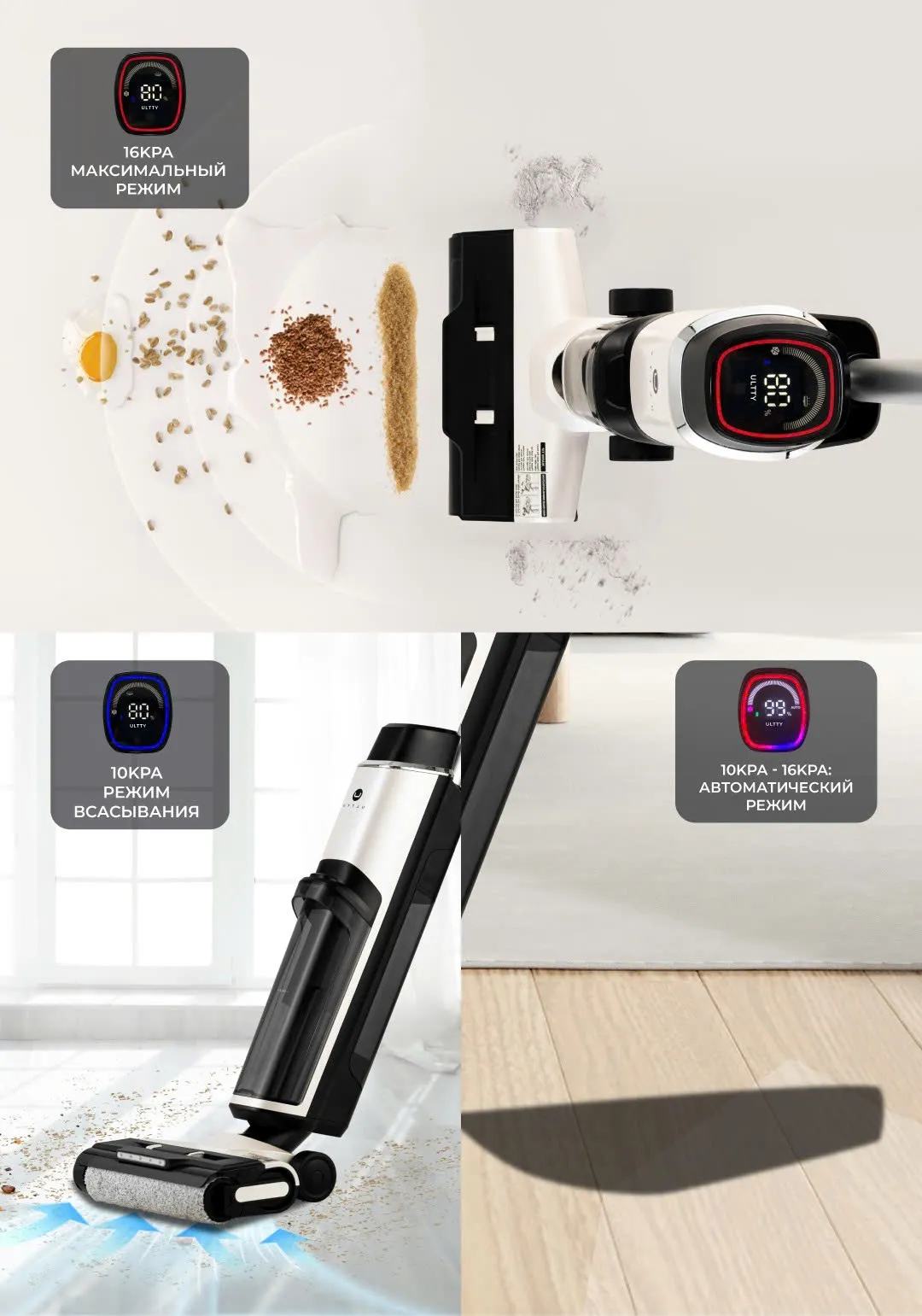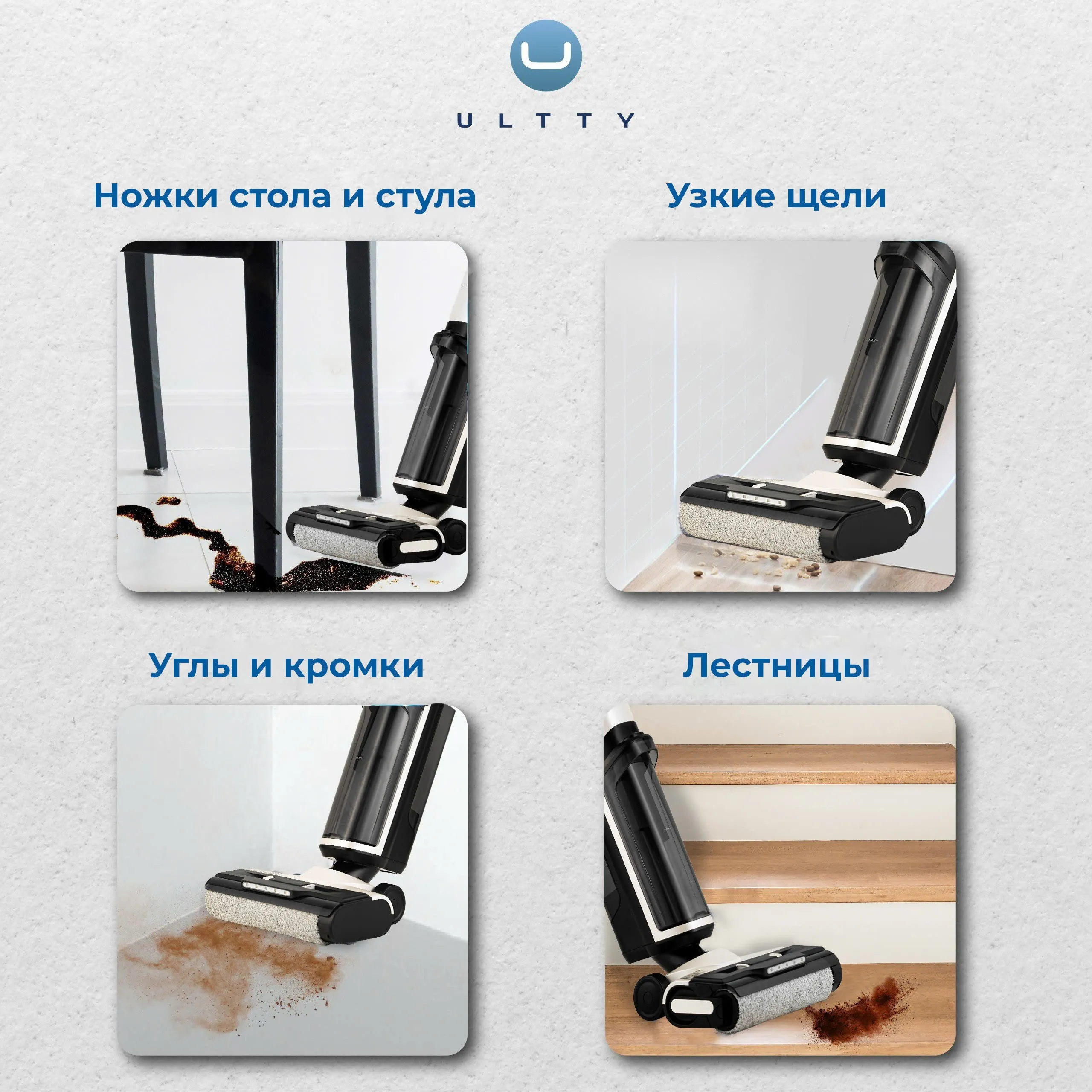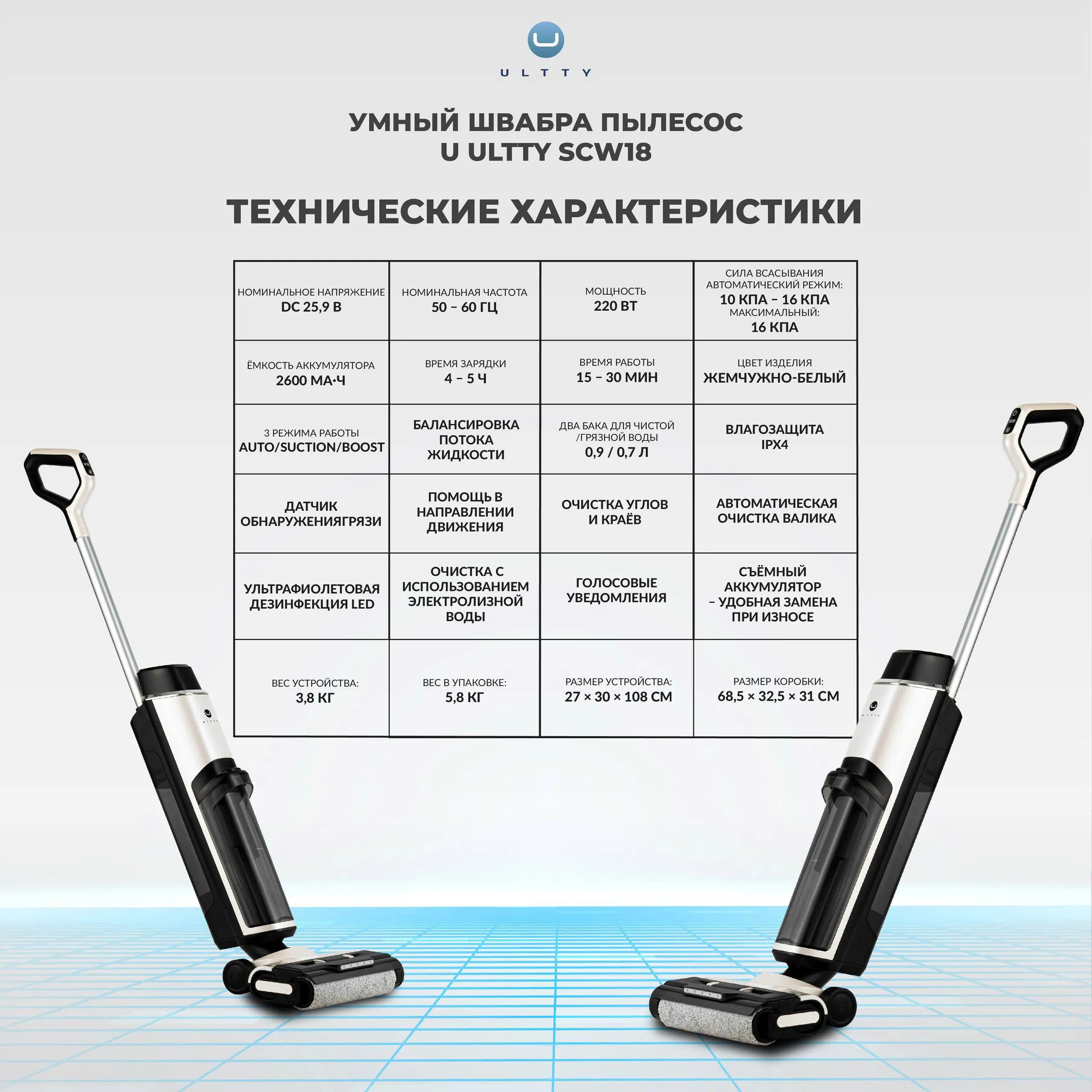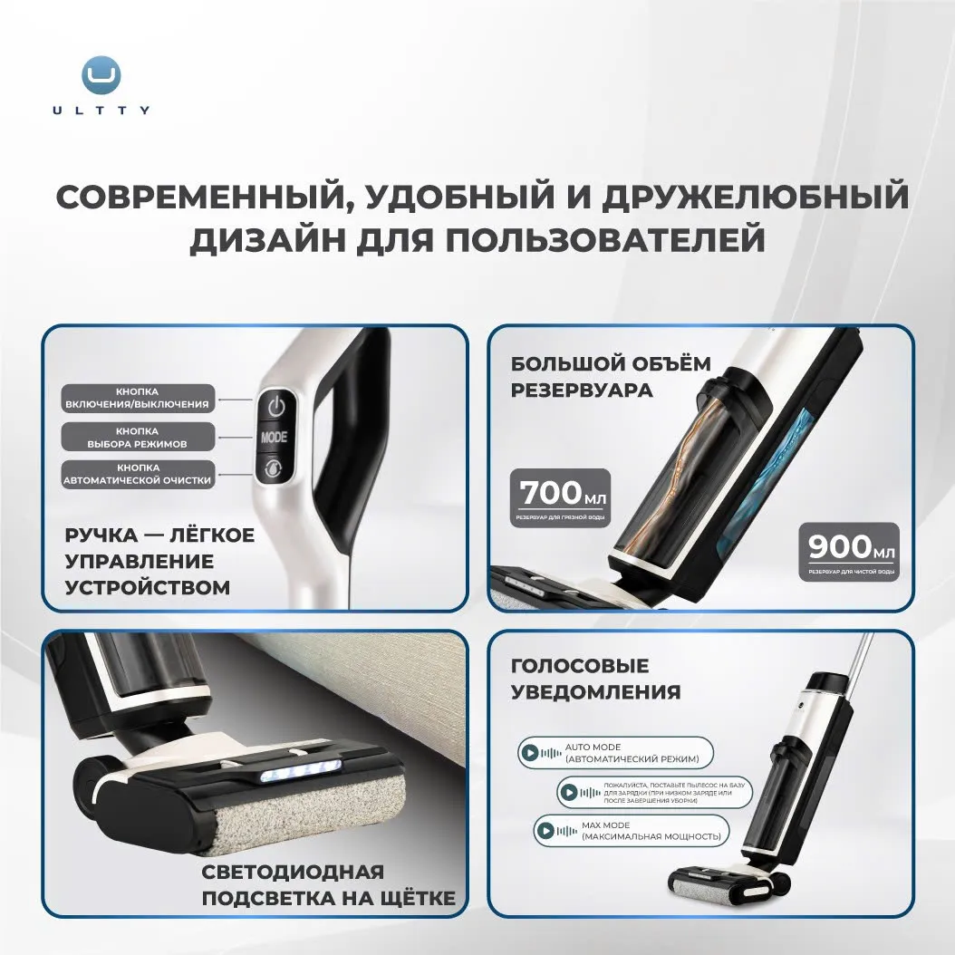 - Больше не нужно выбирать между всасыванием и мытьём пола — ULTTY SCW18 экономит время и силы, выполняя обе задачи одновременно и обеспечивая высокую эффективность уборки.
