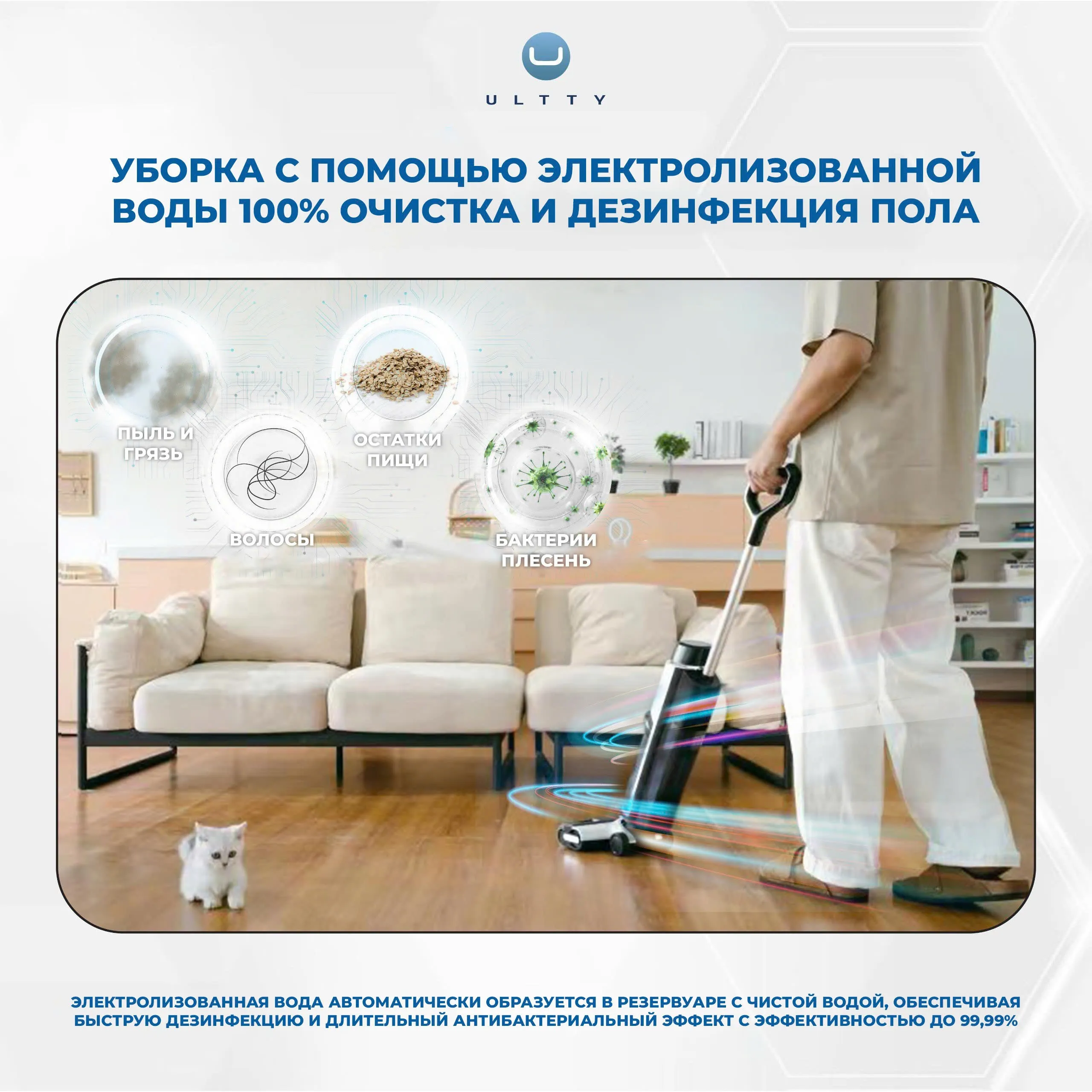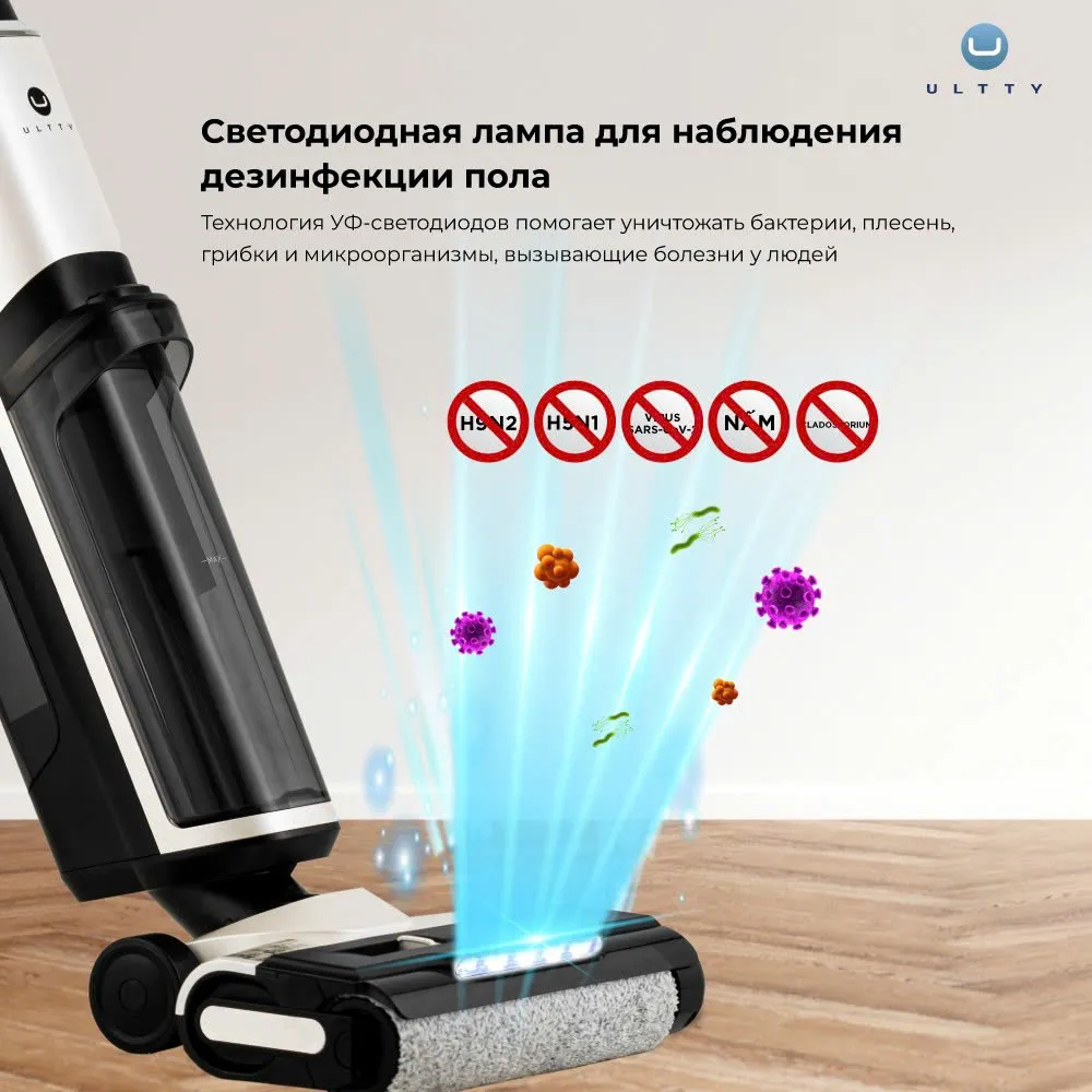 Обеспечивая чистоту и дезинфекцию до 99,999% с помощью электролизованной органической воды и UVC-лучей, ULTTY SCW18 обеспечивает идеальную эффективность на твёрдых покрытиях, таких как гостиная, кухня, ванная и др., создавая чистое и свежее пространство в доме. ULTTY SCW18 — это лучший выбор для тех, кто ищет современный и продвинутый ручной пылесос.